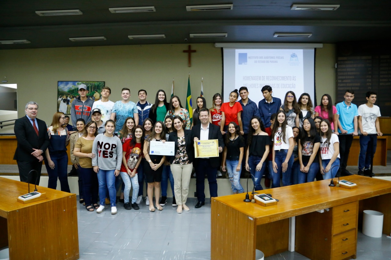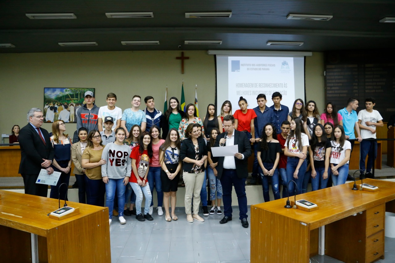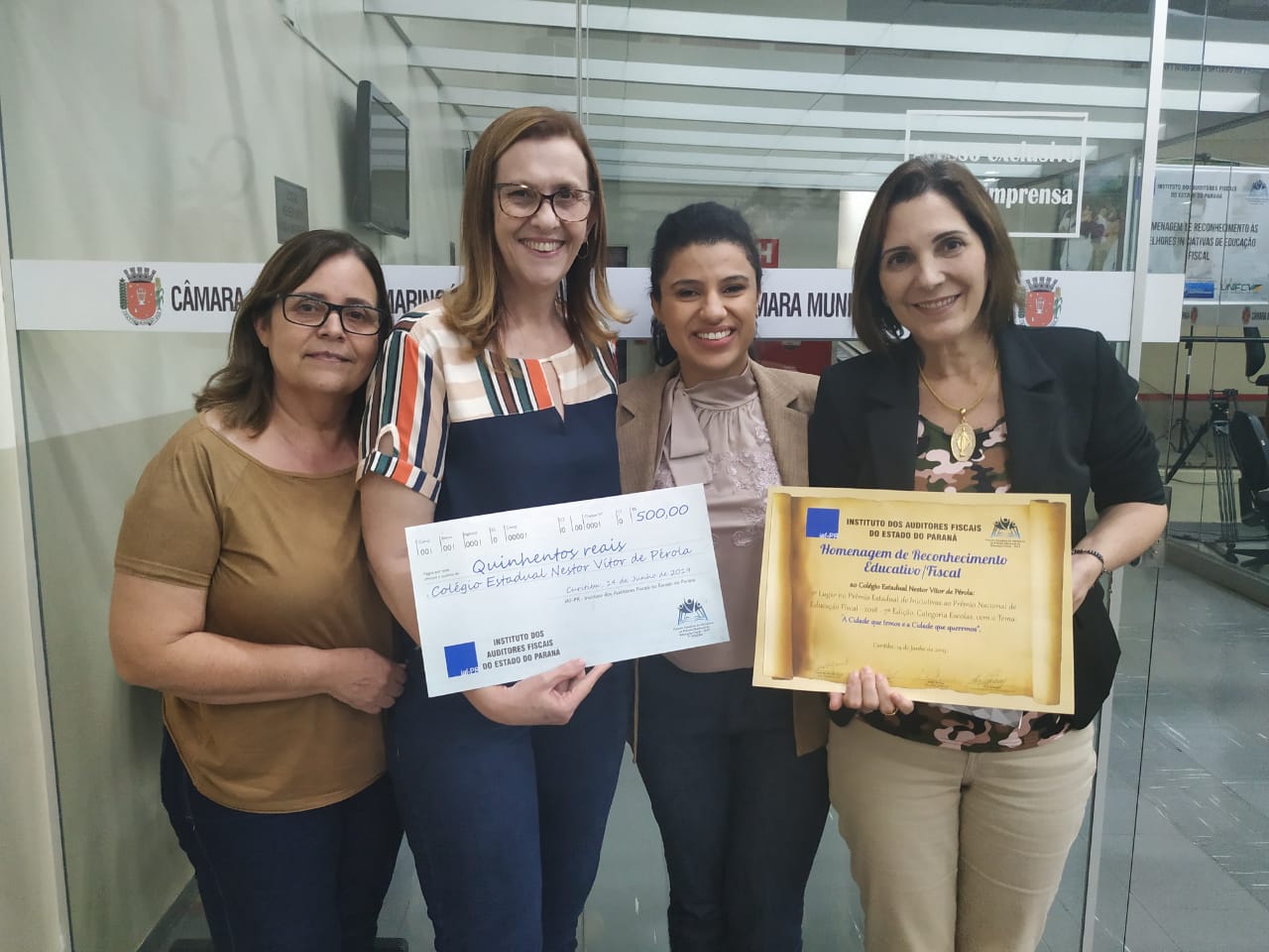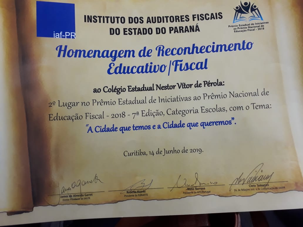 Na última sexta-feira, 14 de junho de 2019, o Colégio Estadual Nestor Victor, localizado no município de Pérola, recebeu o Prêmio Estadual de Iniciativas ao Prêmio Nacional de Educação Fiscal 2018 em sua 7ª edição, promovido pelo Instituto dos Auditores Fiscais do Estado do Paraná (IAF-PR) e a cerimônia de divulgação do resultado aconteceu no Plenário da Câmara Municipal de Maringá.