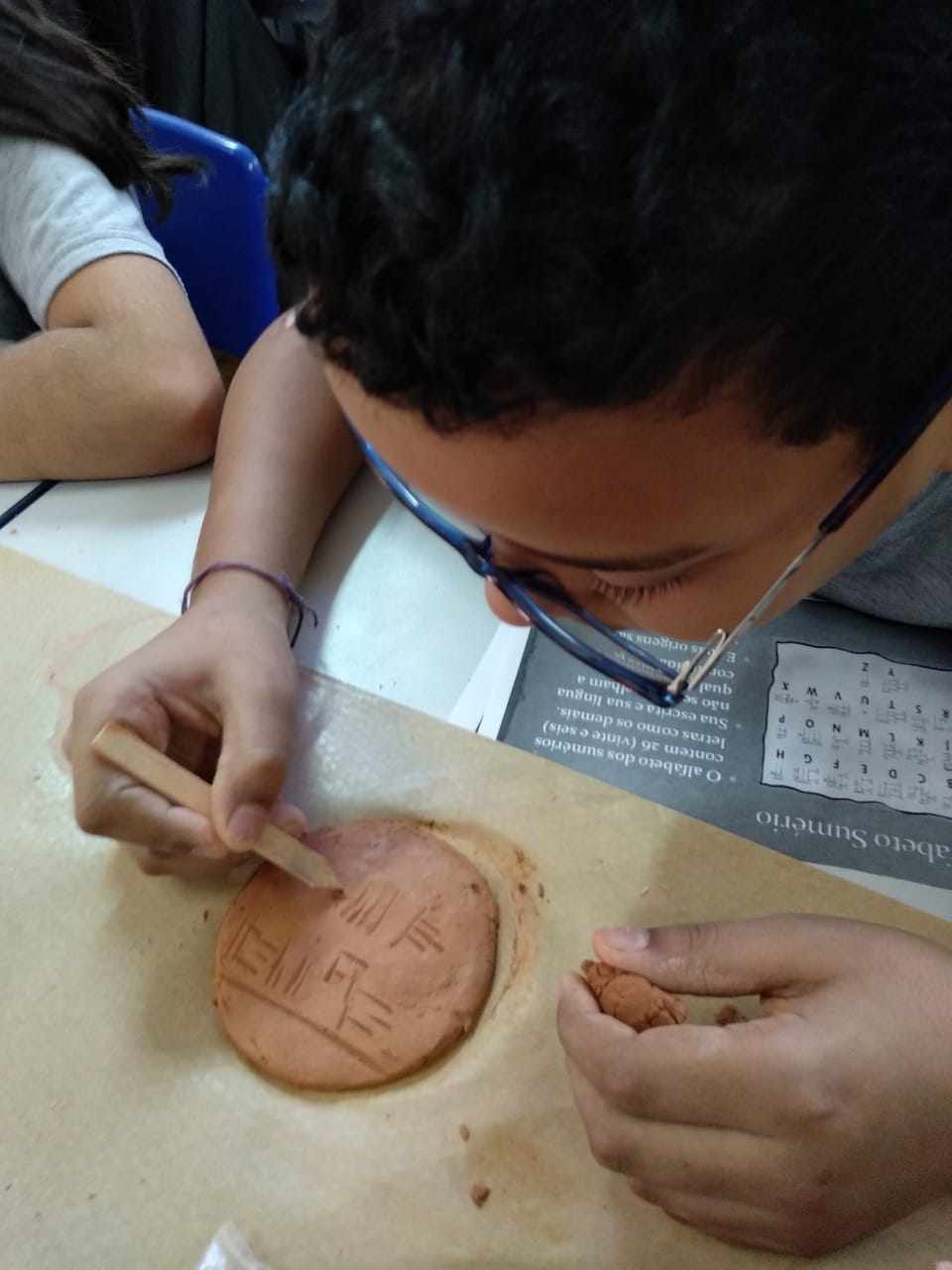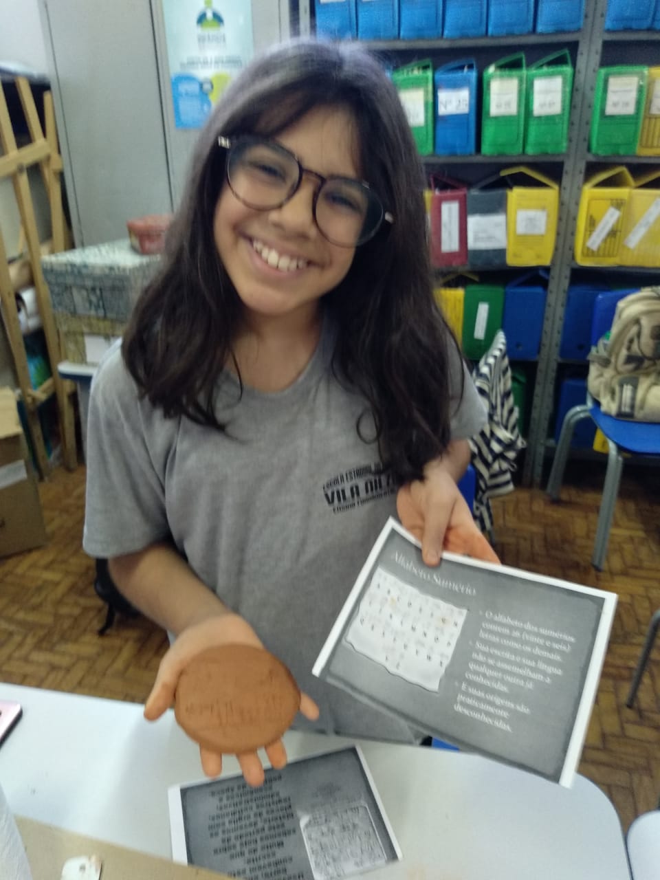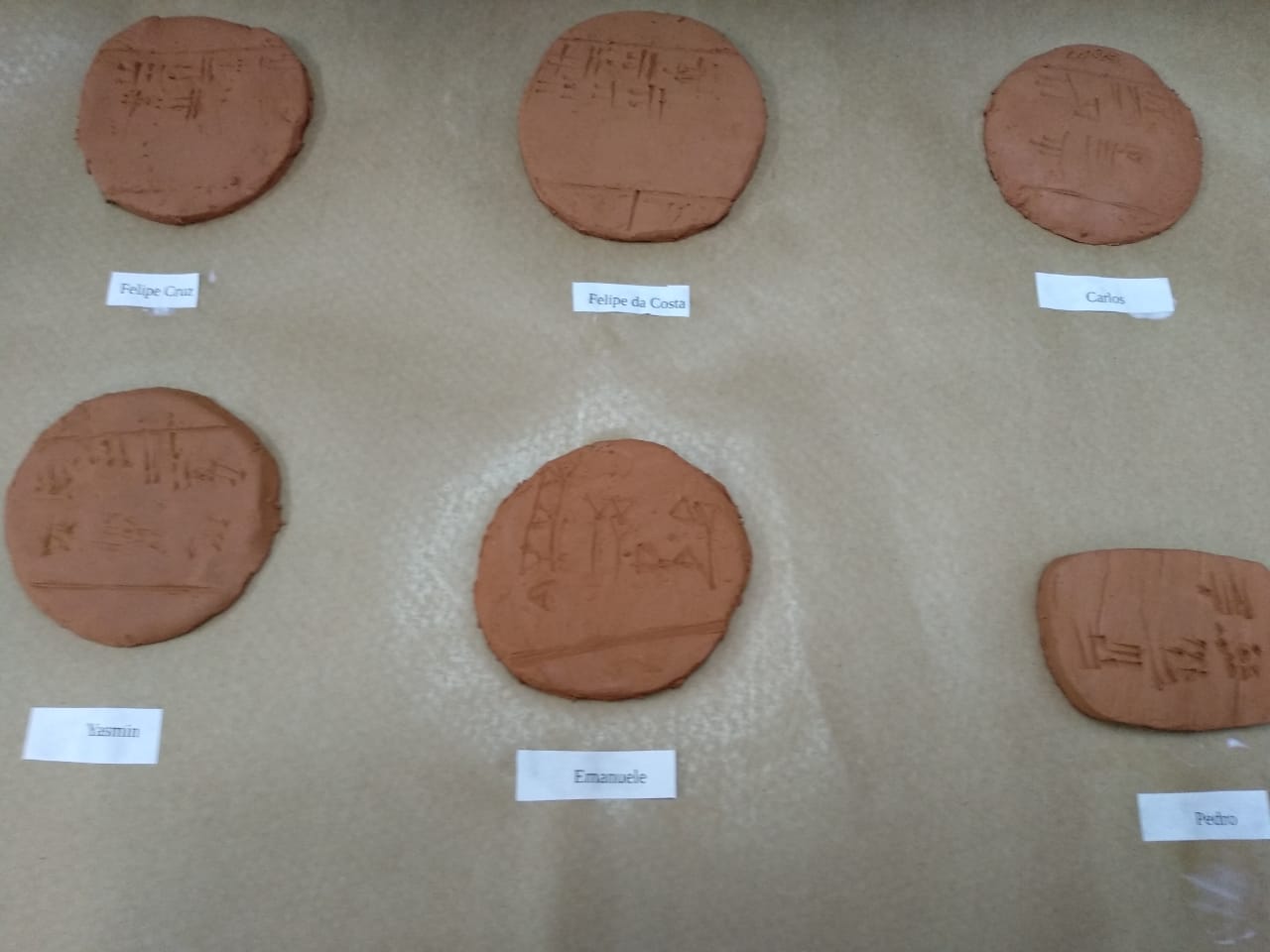 Os alunos manusearam a argila criando uma tabuleta aonde escreveram o seu nome utilizando o antigo alfabeto sumério (primeira forma de escrita da história). Nessa atividade, os alunos aprenderam a interpretar fontes históricas, construindo um contexto com base nas fontes, que é o objetivo central das aulas de história.