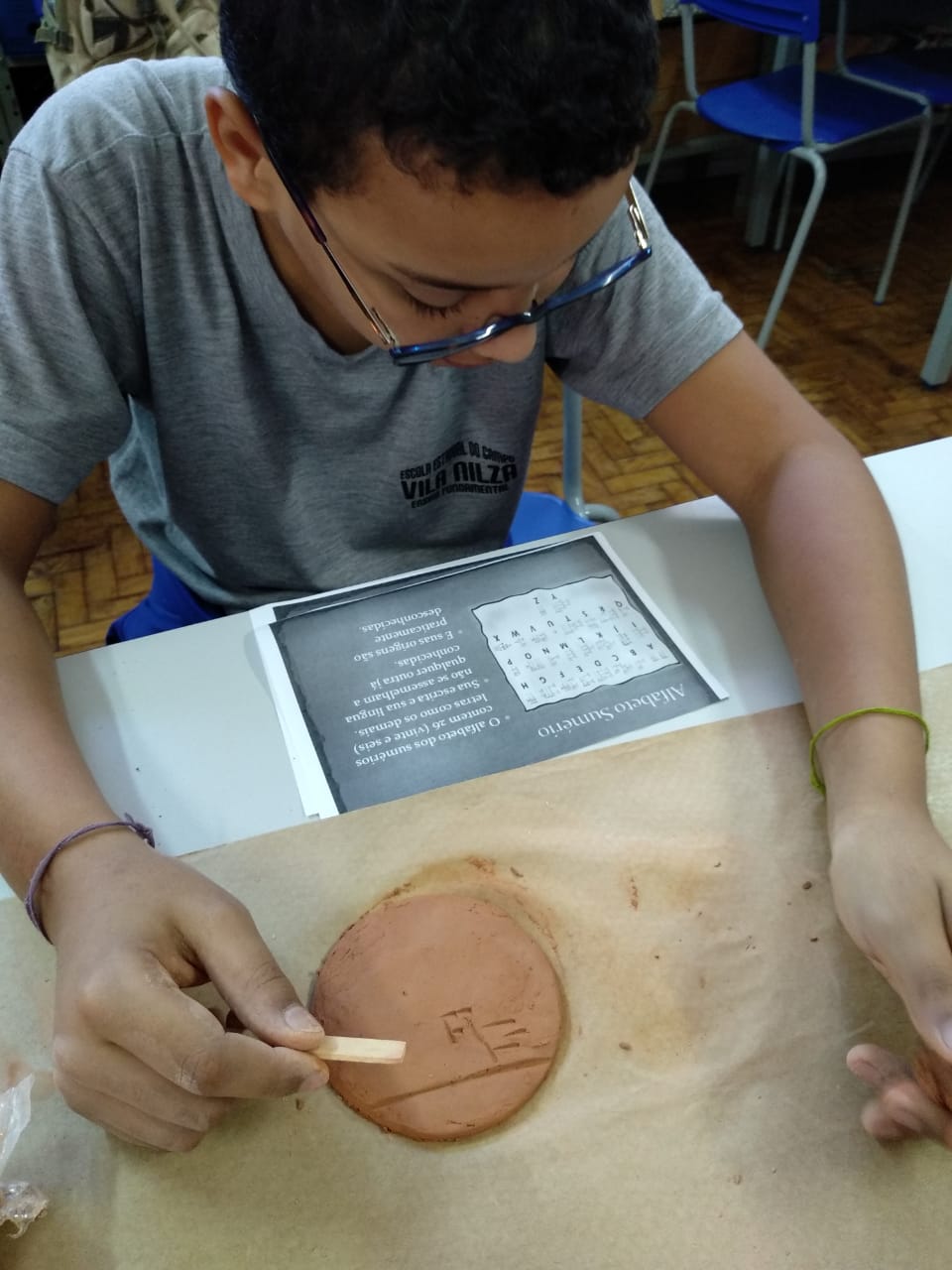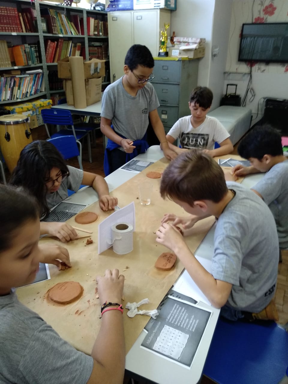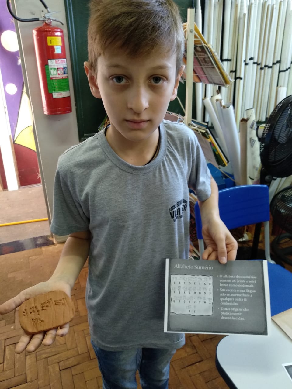 Os alunos manusearam a argila criando uma tabuleta aonde escreveram o seu nome utilizando o antigo alfabeto sumério (primeira forma de escrita da história). Nessa atividade, os alunos aprenderam a interpretar fontes históricas, construindo um contexto com base nas fontes, que é o objetivo central das aulas de história.